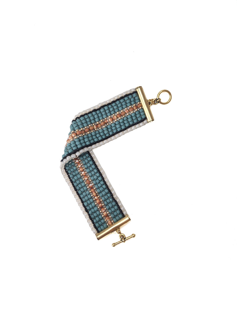 Turquoise and coral handwoven silk thread glass beaded cuff bracelet. Brass toggle clasp. 6", very small and is meant to fit snug. Remove for bathing or swimming.